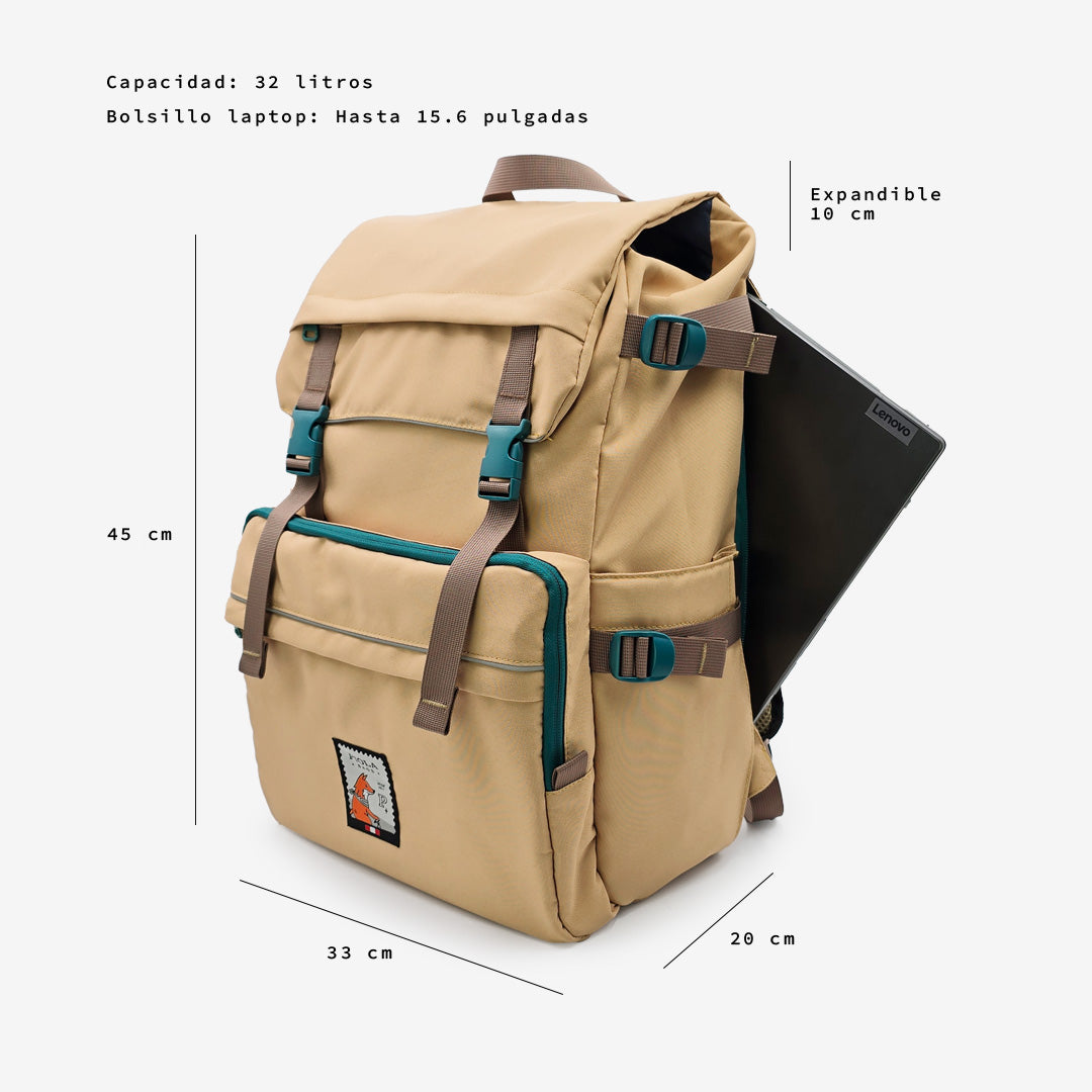 Resistente y espaciosa. Pensada para viajes, con un diseño expansible para hacerle espacio a eso extra. Múltiples bolsillos con buena capacidad y un bolsillo secreto en la espalda para llevar la laptop.