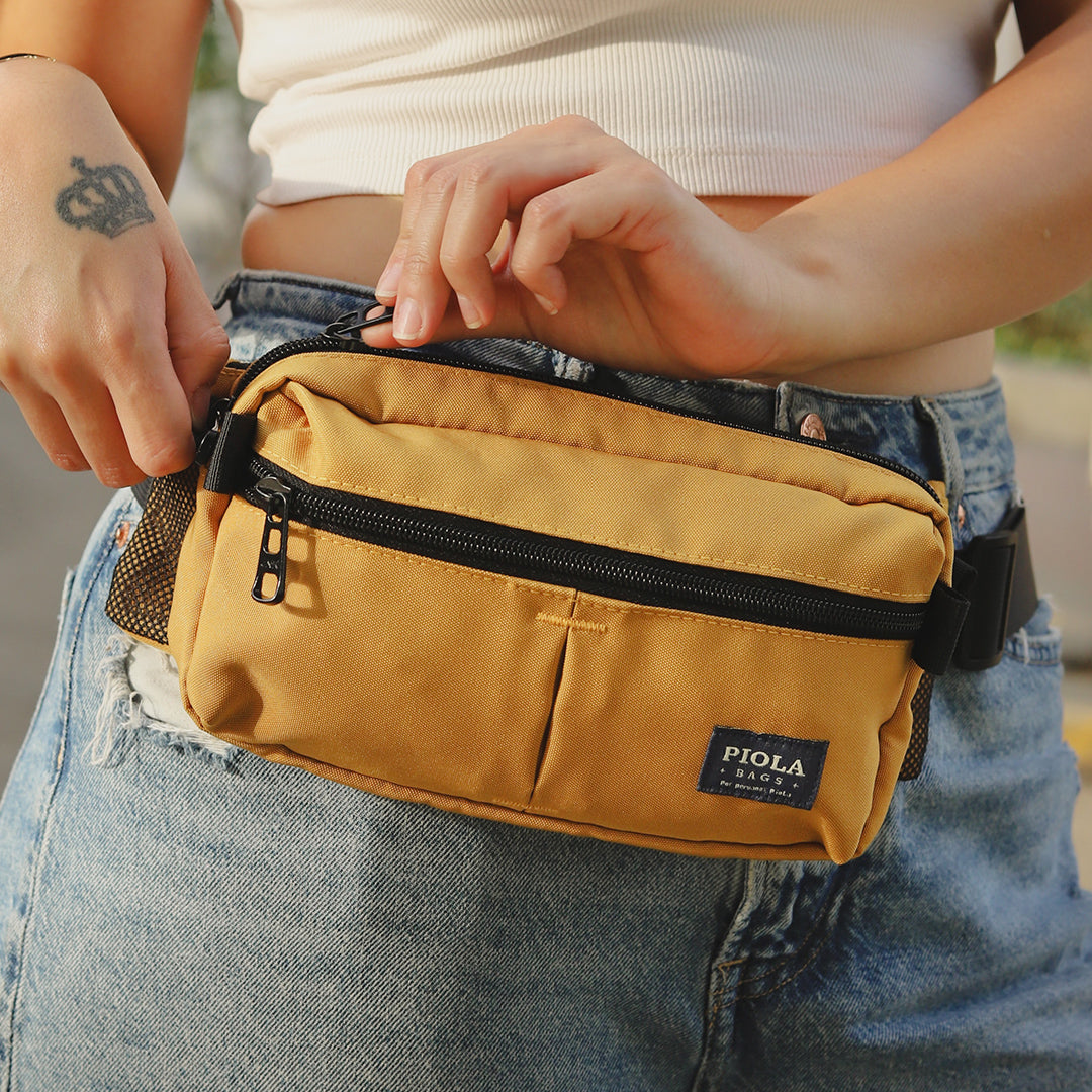 canguro larco cerrado en color mostaza, estilo urbano y unico para la ciudad, producto local hecho por Piola Bags.